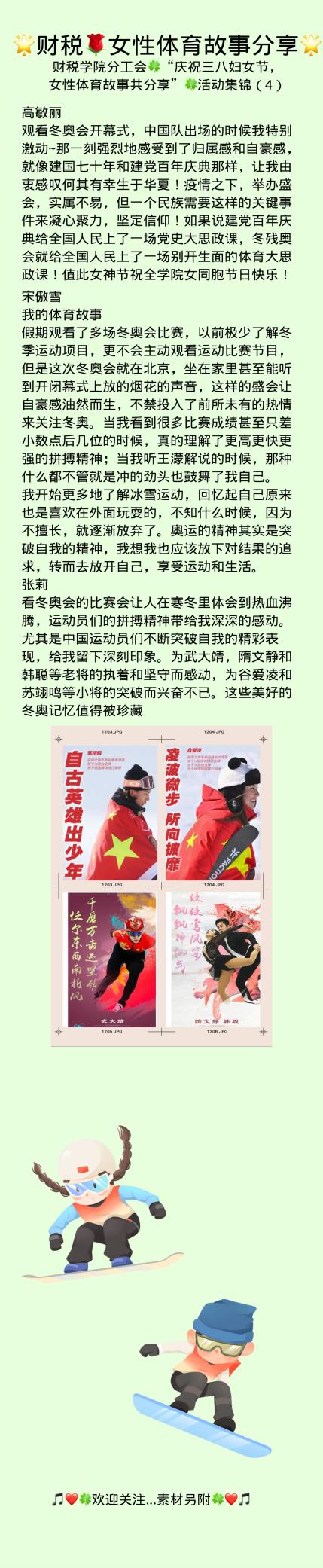为庆祝第112个国际“三八”妇女节, 2022年3月8日,在校工会和学校党委的支持下,财税学院分工会举办的“庆祝三八妇女节,女性力量共享”活动顺利开展。财税学院全体女教职工积极响应,观看了女足比赛、收看了冬奥会比赛、参与了冬奥志愿、并投身于运动和健身中。围绕“我的体育故事”的主题,她们分享了亲身经历的感想和体会,展示了新时代女性爱国情怀、健康向上的精神风貌。