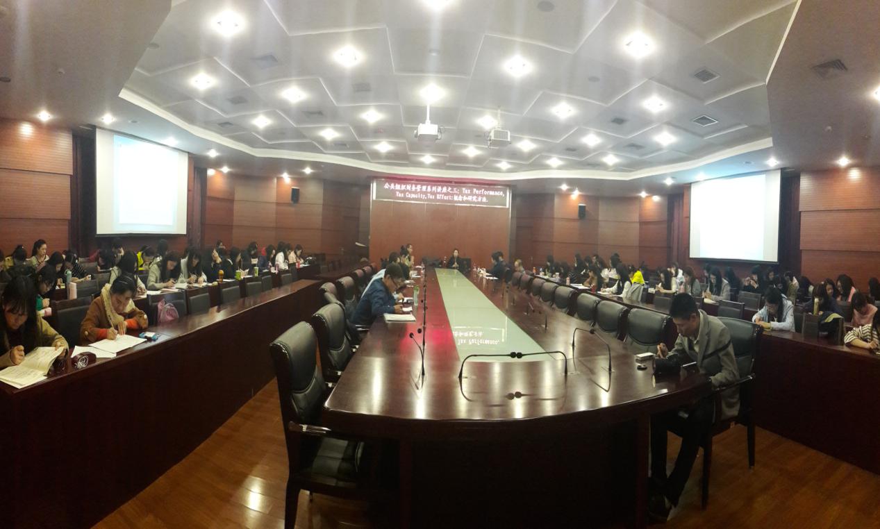 政税务学院姚东旭院长出席并主持讲座,财政系杨全社教授参会,2015级、2016级财政学学术硕士、2016级税务专业硕士等100名余研究生在现场听取讲座。