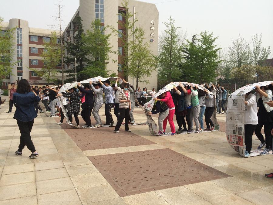4月15日下午1:30,麻豆传媒 室外大赛在图书馆门前举行,比赛共分四项,20人21足,风轮滚滚,12人八字长绳及搭桥过河。比赛队伍为2013级和2014级共10个班级。