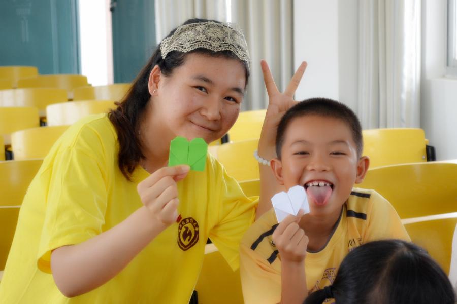 实践团成员带去了漂亮的手工彩纸和一些小文具,手把手地教当地的小朋友彩纸手工制作,与小朋友们共同制作了很多充满温情的手工作品。实践团成员与当地师生的脸上都洋溢着幸福的笑容。教室内不时传出孩子们阵阵歌声与欢笑声。