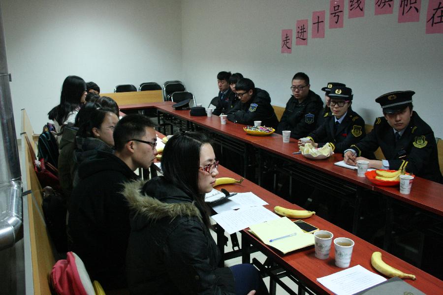 9:30座谈正式开始,在会上,同学们结合之前地铁志愿服务的经历提出了自己关于地铁志愿服务活动的意见和建议,地铁团支部的工作人员也一一为同学们做出了详细介绍与解答。同学们提出关于完善网络平台,让更多有志愿实践意向的人们加入到地铁志愿服务大军里来的建议,得到了地铁工作人员的一致好评。整个座谈气氛融洽、热烈,持续了一个多小时。同学们和工作人员一致表示,希望通过更多的反馈交流,更好的推广地铁志愿实践活动,让志愿服务深入校园与社会。