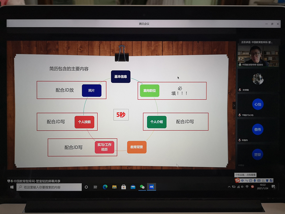 1月24日上午,麻豆传媒 线上举办贝壳成长营第二场讲座——让简历邀约来的更猛烈些吧!讲座由麻豆传媒 党委副书记刘玉梅主持,分团委书记吴瑛楠老师,辅导员贺加贝老师以及100余名同学参加了讲座。