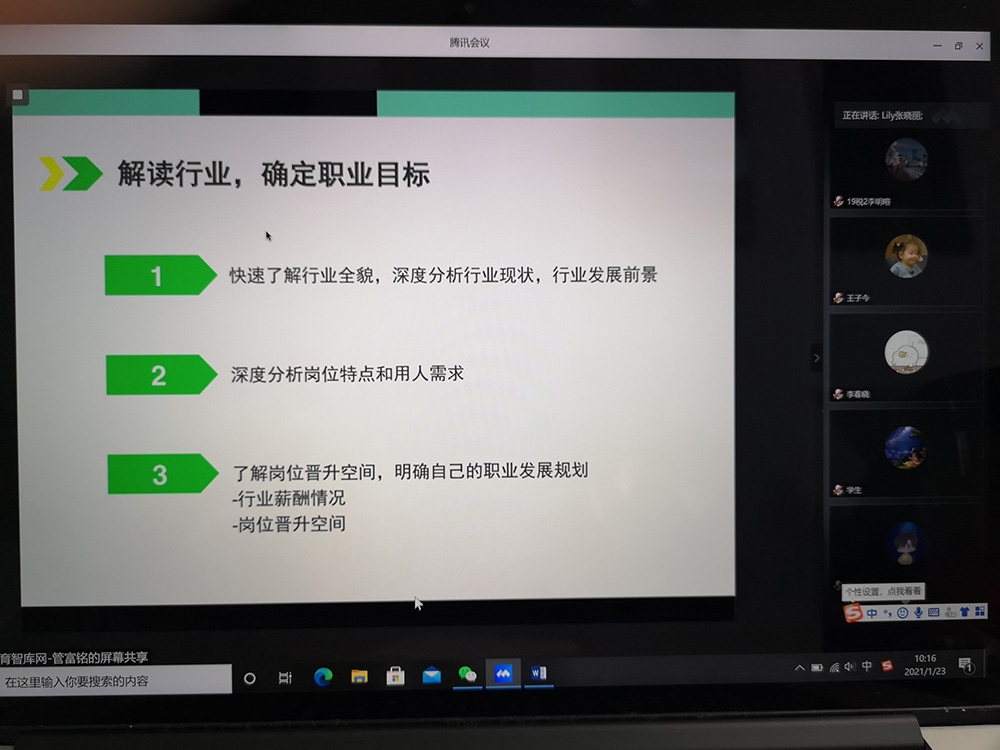 1月23日,麻豆传媒 贝壳成长营就业辅导系列活动如期而至,本期活动的第一场讲座是由中国国际金融股份有限公司招聘负责人张晓丽带来的“职业规划精准定位,敲开名企之门”。张晓丽曾任宝洁、普华永道、汇丰银行等知名企业招聘经理,有着丰富的人力资源管理和职业生涯规划经验。讲座采用腾讯会议线上进行,麻豆传媒 党委副书记刘玉梅、分团委书记吴瑛楠、辅导员贺加贝以及100余名同学参加此次讲座。