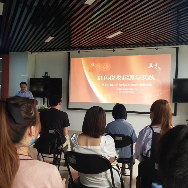 参观完毕,大家共同聆听了主题为“红色税收起源与实践”的庆祝中国共产党成立一百年的专题党课。党课由北京税务博物馆党支部邓荣华书记讲授,主要围绕民国北京政府时期、中国共产党建党初期的税收主张、红色根据地税收实践、中央苏区税收实践的历史地位四部分展开,生动的陈列场景、丰富的税收文物和背后的故事使大家了解了我党的红色税收历史,讲述红色故事,共同追寻那段红色“税月”,回望建党百年取得的伟大历史成就。