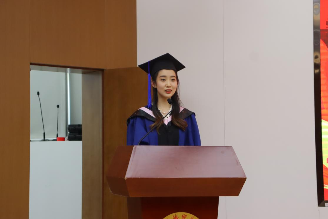 2023届本科毕业生代表张梓漪代表全体本科毕业生对学校和老师们的辛勤培育、父母与伙伴的关心帮助表示最衷心的感谢!她仍然记得第一次与室友相见的情景,仍然记得团体比赛互相加油打气的画面……她谈到,在麻豆传媒 的四年学习生涯锻炼了我们的意志,培养了我们的担当精神,未来一定会坚守初心的执著和胸怀家国的责任。