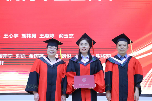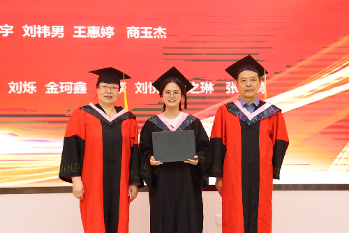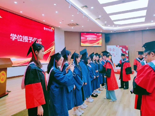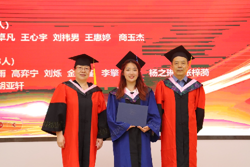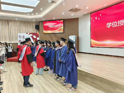 随后,在激昂的乐曲声中,同学们身着学位服依次有序走上主席台,学院院长李红霞、党委书记刘学伟首先为2023届优秀毕业生们扶正流苏,接着学院领导为全体毕业生拨穗并颁发证书。
