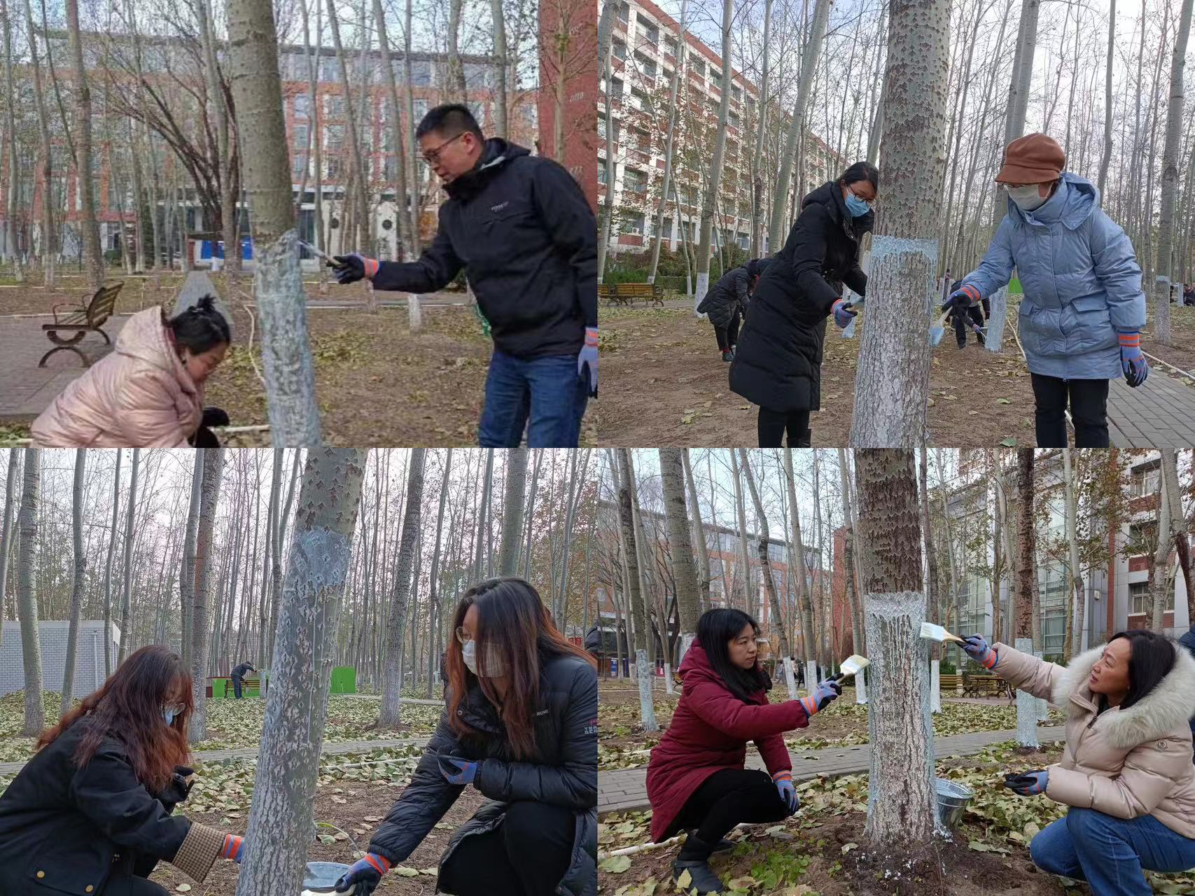 随后,后勤管理处杨慧雯老师详细讲解了大树涂白的具体步骤,并解释了涂白的作用和功效。听完讲解,老师们和同学们马上行动起来,寂静的校园立刻热闹非凡。只见大家纷纷戴好手套,一手提着石灰浆桶,一手拿刷子,两人一组,在后勤园林师傅的示范下,认真仔细、有条不紊地开始工作。大家从树的上部开始,一圈一圈往下涂刷,确保每一寸树干都涂抹均匀,不留空隙。经过老师们的共同努力,博学楼南侧树林的树木都穿上了“白色冬装”,一排排、一行行整齐洁白的树干也成为冬日校园里一道靓丽的风景线。