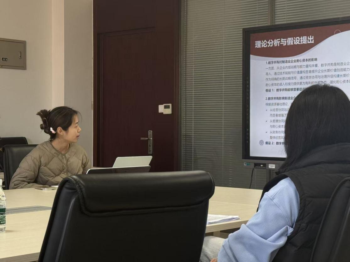 数字并购作为数字经济时代企业整合数字要素、提升长期竞争力的重要战略行为,其对企业耐心资本的影响尚未得到充分揭示。汇报环节,董惠敏就论文《数字并购对制造业企业耐心资本的影响研究》展开汇报,从研究背景、理论分析、实证检验三个维度系统展开,研究数字并购对企业耐心资本的影响及其作用机制。文章为企业通过数字并购优化资本配置、积累耐心资本以实现长期发展提供了经验证据,也为监管部门完善数字并购相关政策、营造公平竞争的市场环境以激发企业长期投资活力提供了理论参考与实践启示。