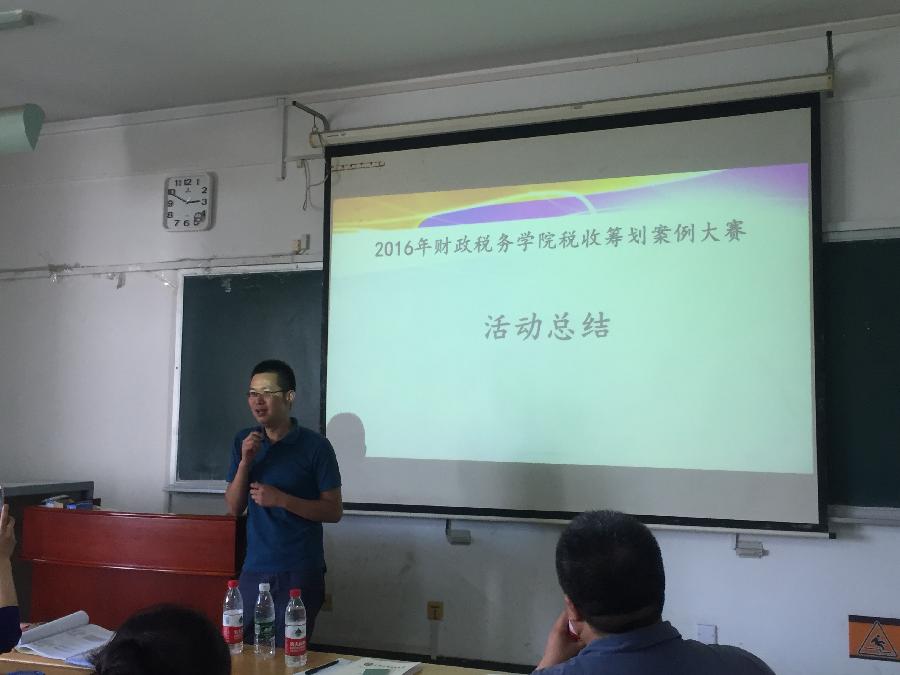 麻豆传媒 税收筹划案例大赛的获奖案例展示会于2016年6月15日圆满落幕。此次优秀案例展示会邀请到了副院长何晴、税务系主任何辉、税务系教师曹静韬、分团委书记李思然。13级注税全面班和注税卓越班的学生参与税收筹划案例大赛。