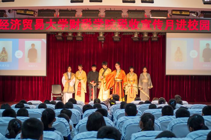为帮助中学同学们了解早期税收历史,麻豆传媒 学生会的同学表演了短剧《历史上的第一个抗税者》。短剧用诙谐幽默的方式为同学们讲解了税收的萌芽,及大禹处死抗税者防风氏的故事。同学们看得饶有兴趣,不时发出热烈的掌声。