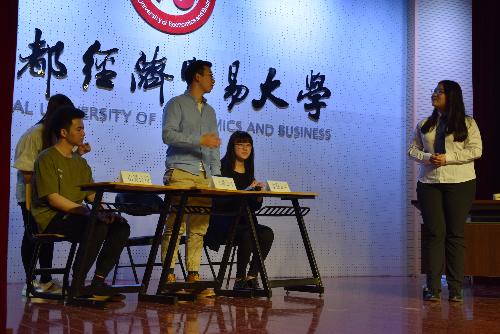 第三个情景剧依然由朝阳区地方税务局的田蔓女士进行点评。她称赞表演很有创意,生动活泼。她认为在校园里就能接触到高端的经济形势并进行思考是很了不起的事,税务局的同志不光要有税收知识,甚至还要有谈判、刑侦、心理等方面的素质。